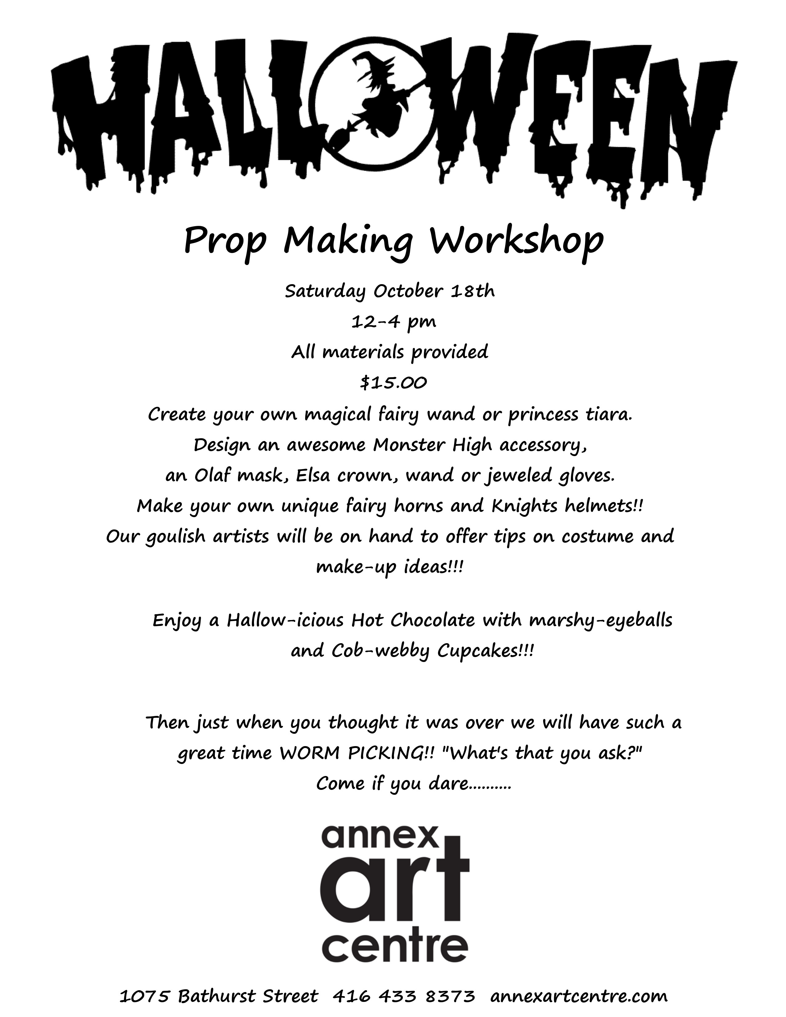 Halloween Prop Making Workshop Calendar Add to Calendar Add to Timely Calendar Add to Google Add to Outlook Add to Apple Calendar Add to other calendar Export to XML When: October 18, 2014 @ 12:00 pm – 4:00 pm 2014-10-18T12:00:00-04:00 2014-10-18T16:00:00-04:00 Where: Annex Art Center 1075 Bathurst Street Toronto, ON M5R 3G8 Canada Cost: $15 Contact: Michele 416 433 8373 Email